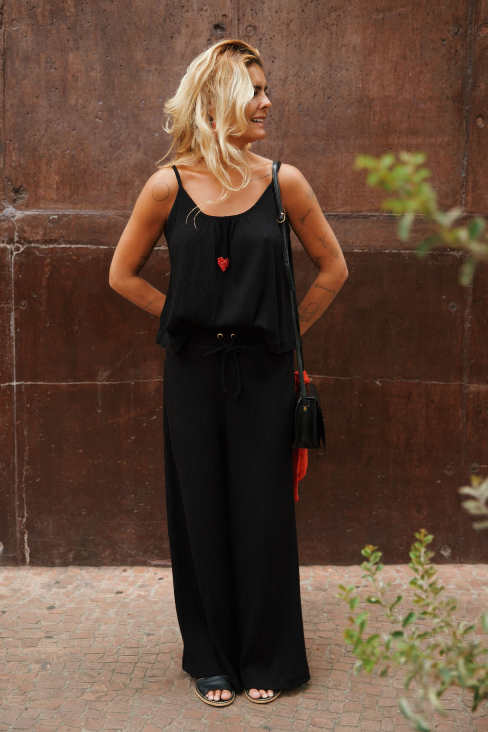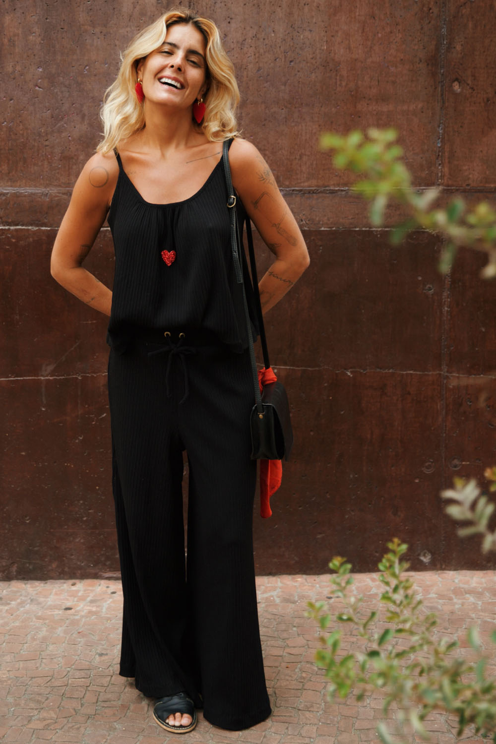 Calça preta, malha canelada, modelo wide leg, cintura alta, alonga a silhueta por ser cintura alta, peça atemporal para seu guarda roupas, cós com elástico.