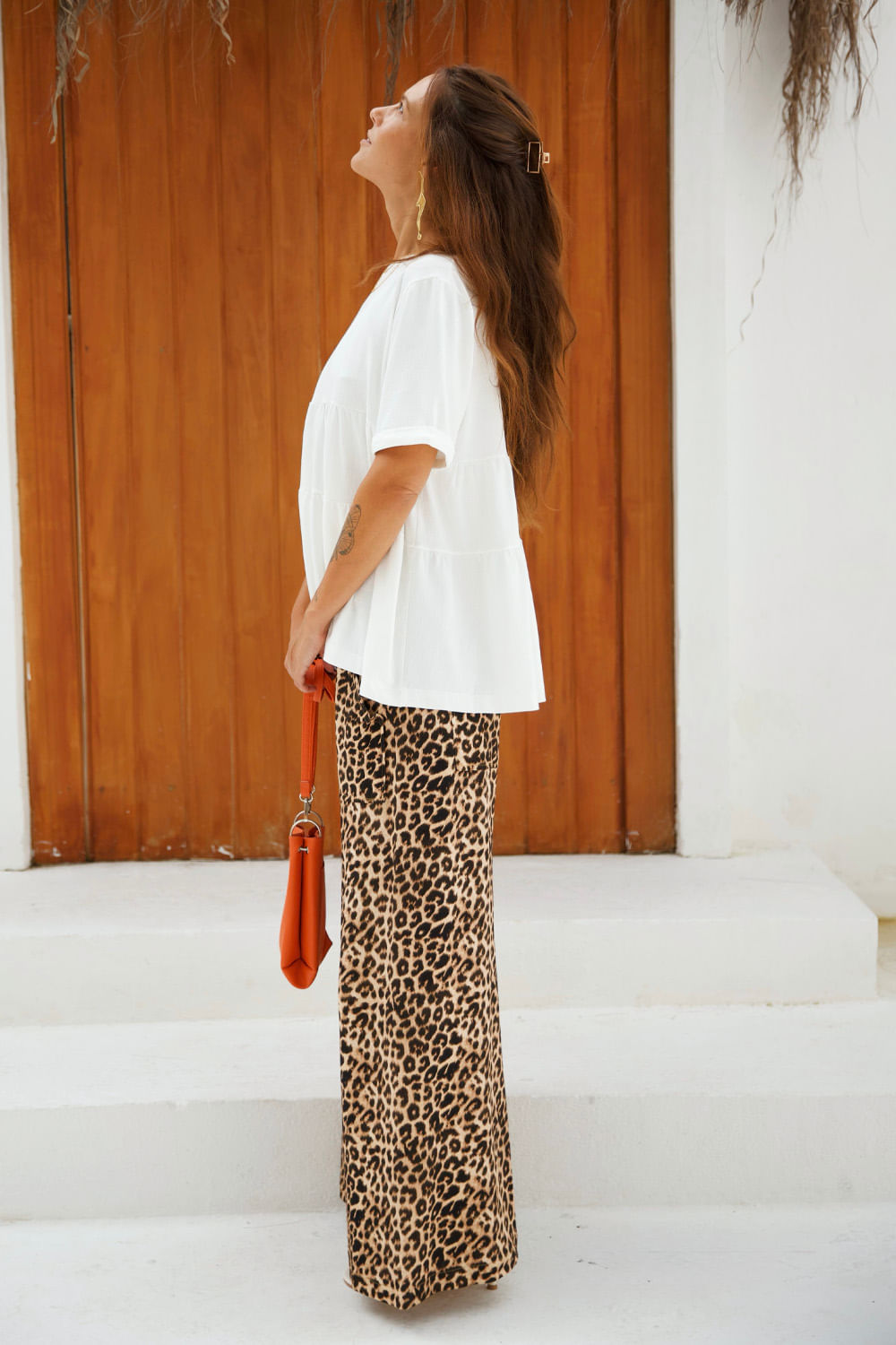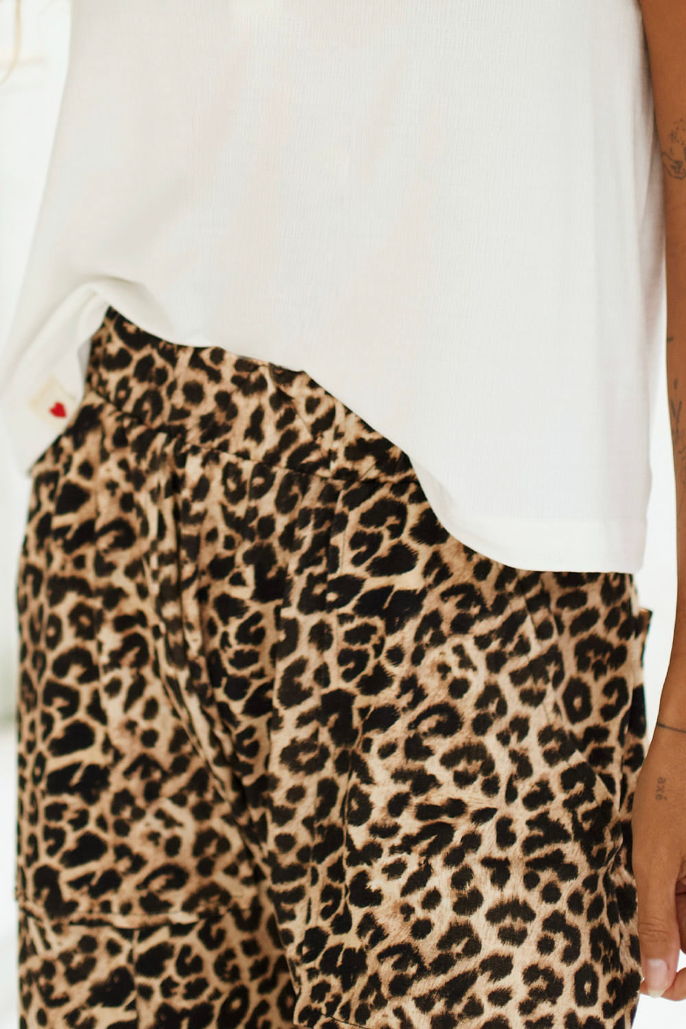 Modelagem ampla e fluida garante liberdade de movimento, enquanto a malha leve de viscose com elastanoproporciona um toque suave e fresco na pele. A estampa animal print, clássica Carmensitas. Cós com elástico extremamente confortável.