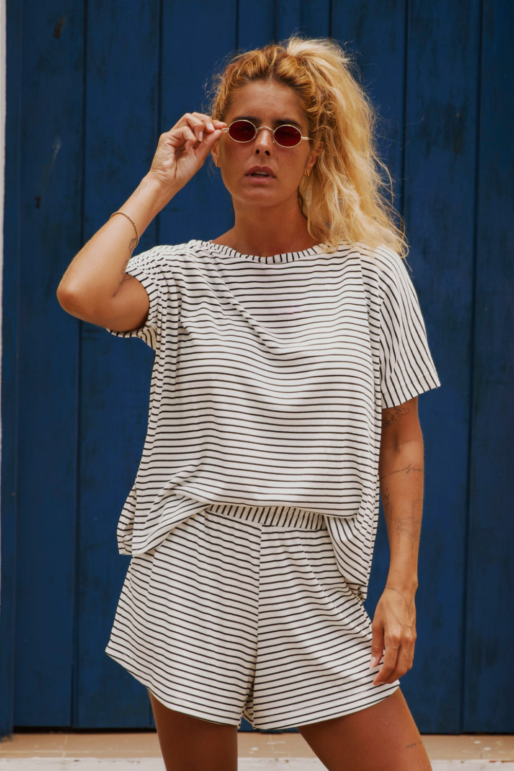 Camiseta modelagem bem soltinha, malha de tricozinho listrada fio tinto, decote canoa.