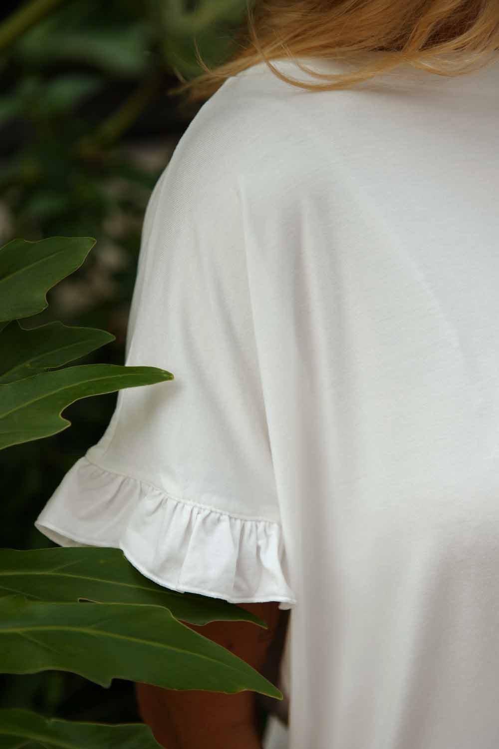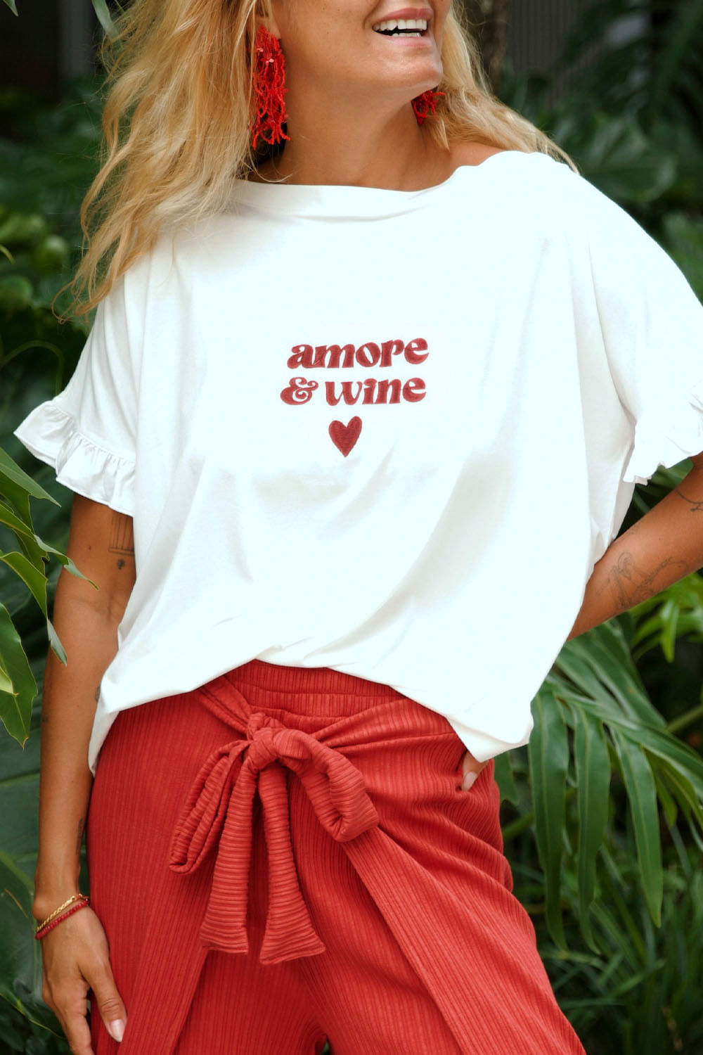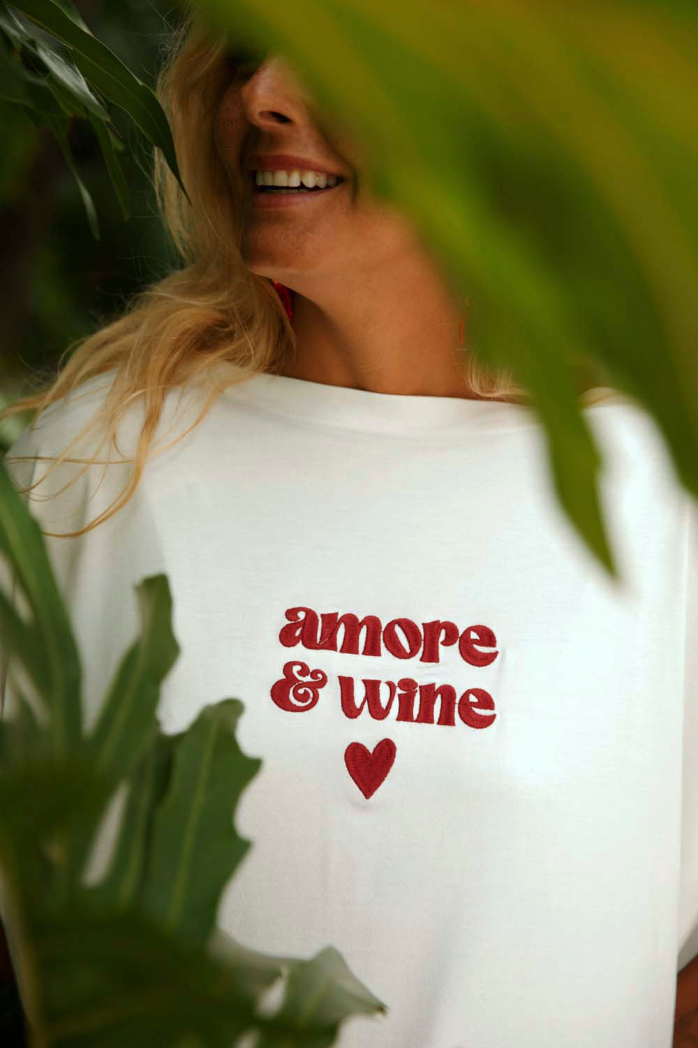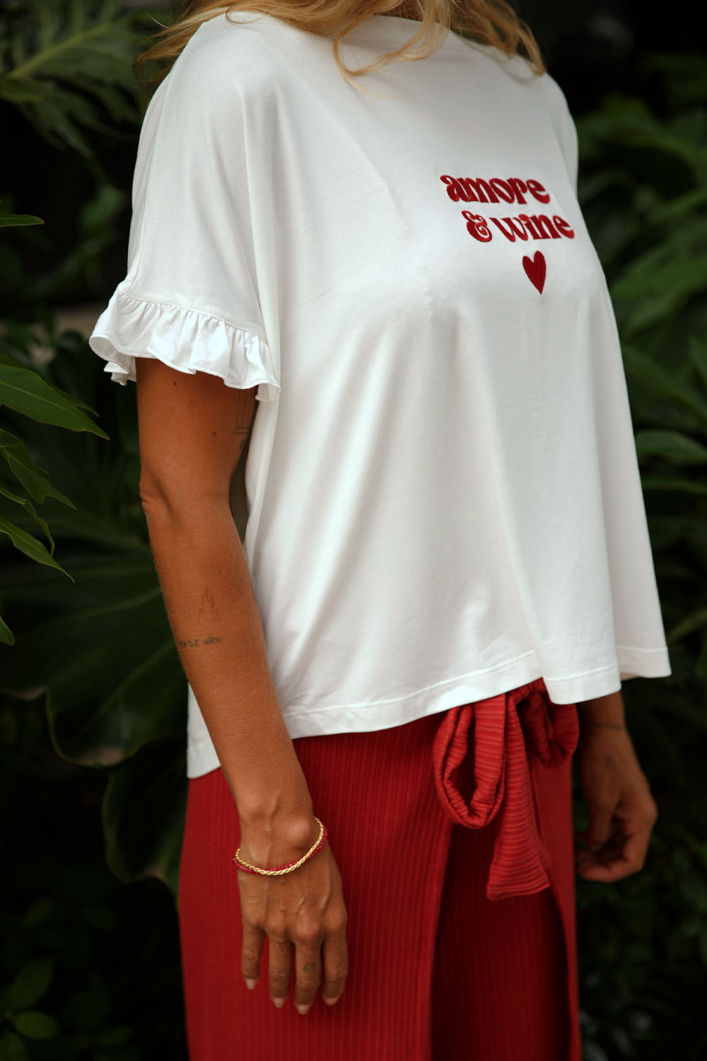 Camiseta em malha leve de viscose com elastano, modelagem bem ampla, bordado Amore e Wine na cor vermelha.