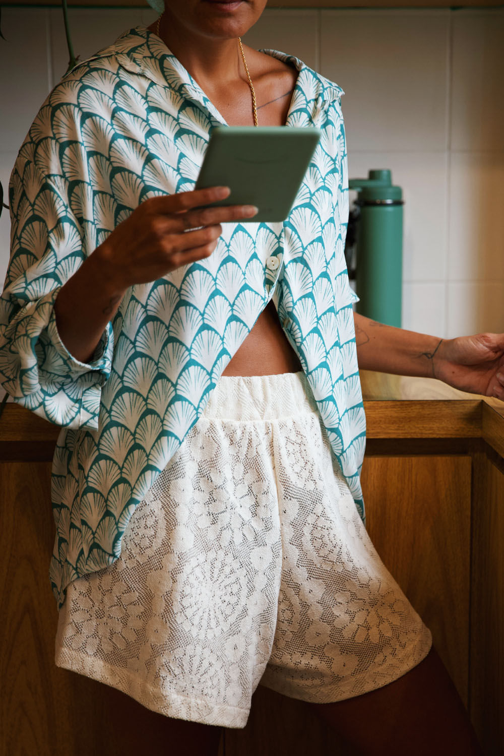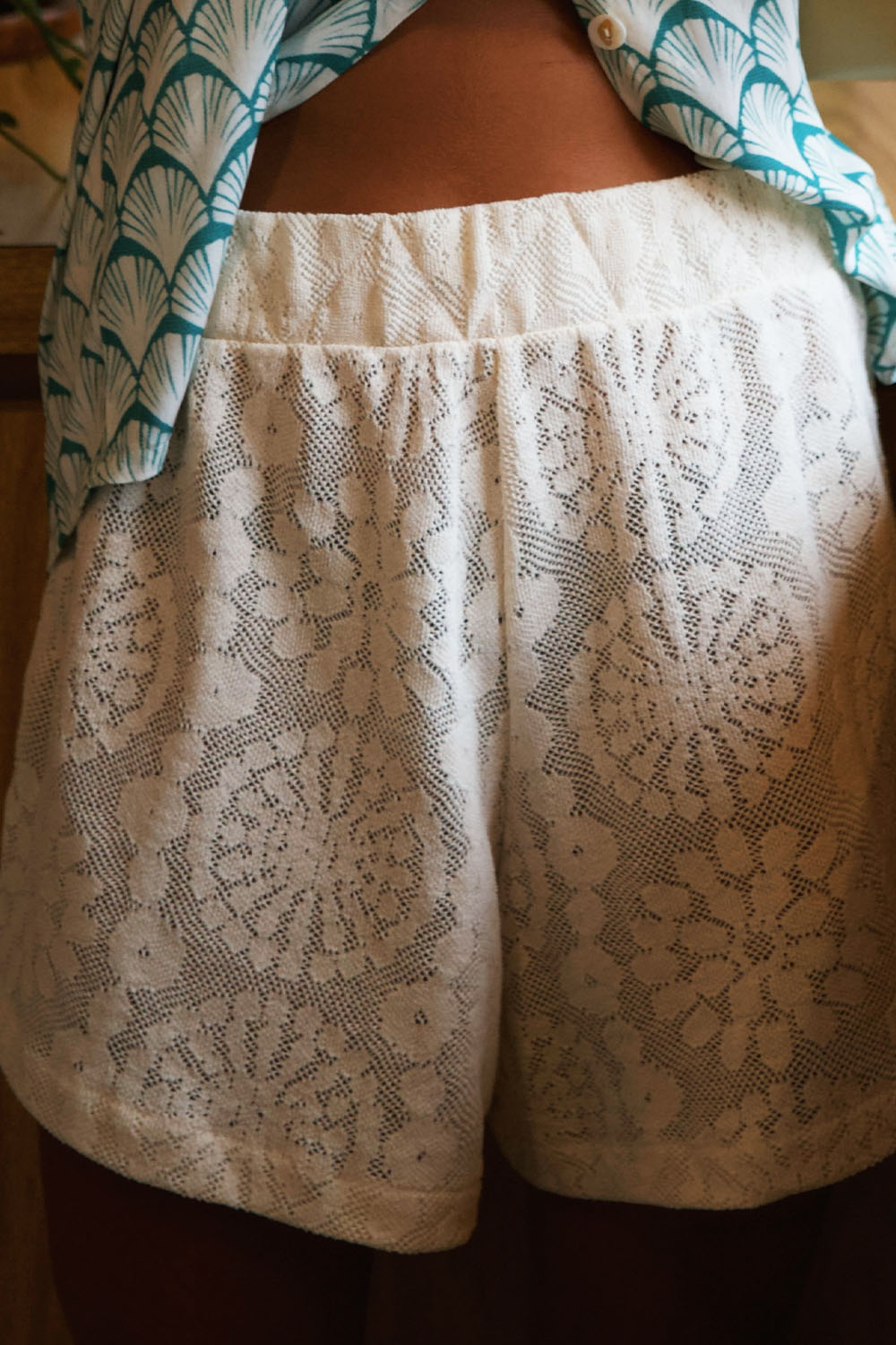 Short em malha de renda, modelagem soltinha, cós com elástico