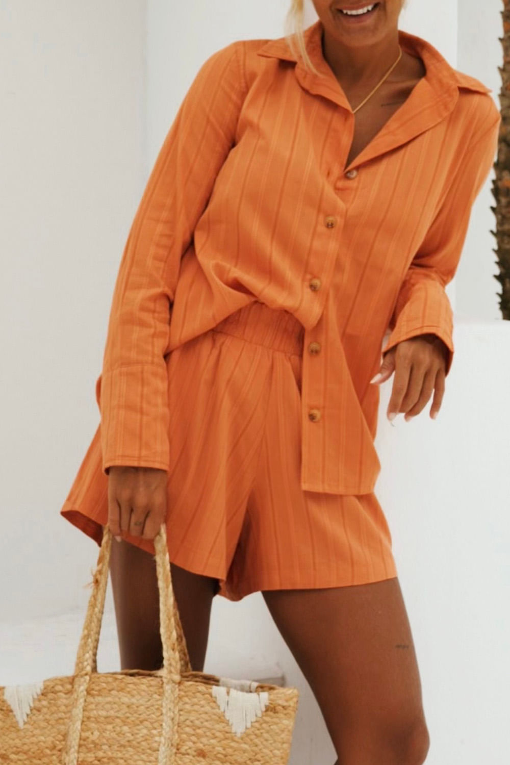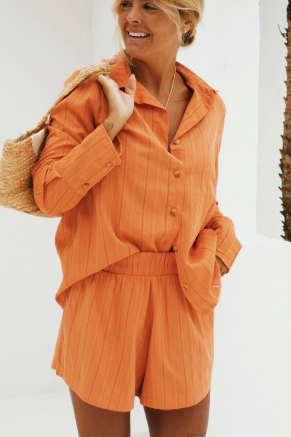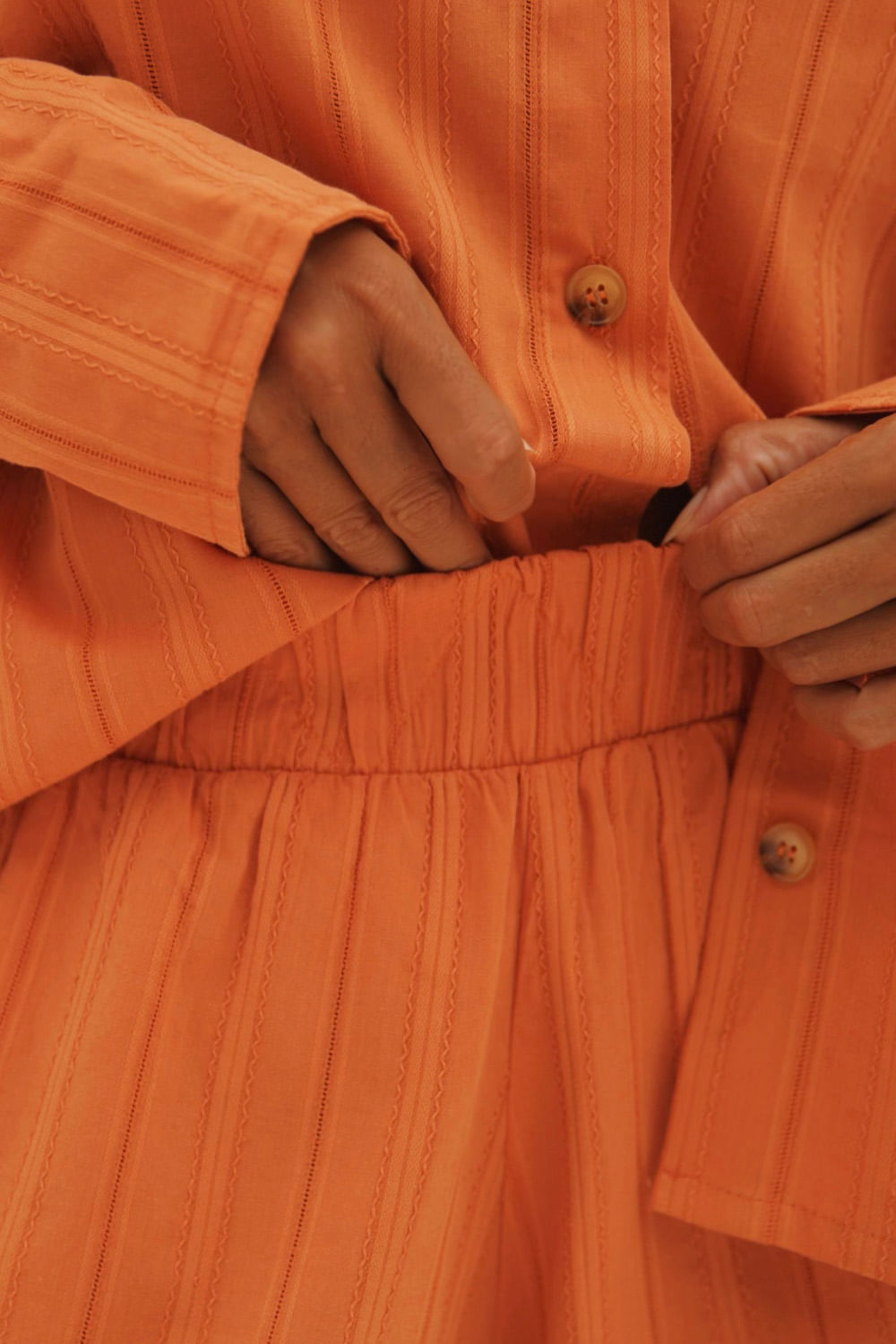 Short em tecido plano 100% algodão maquinetado ( com textura ), modelagem soltinha, cós com elástico, bolsos laterais.