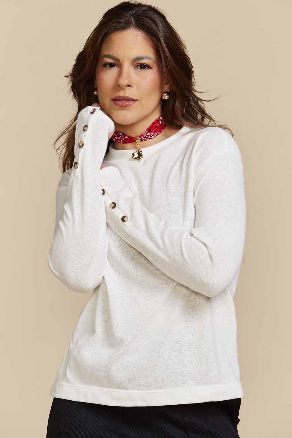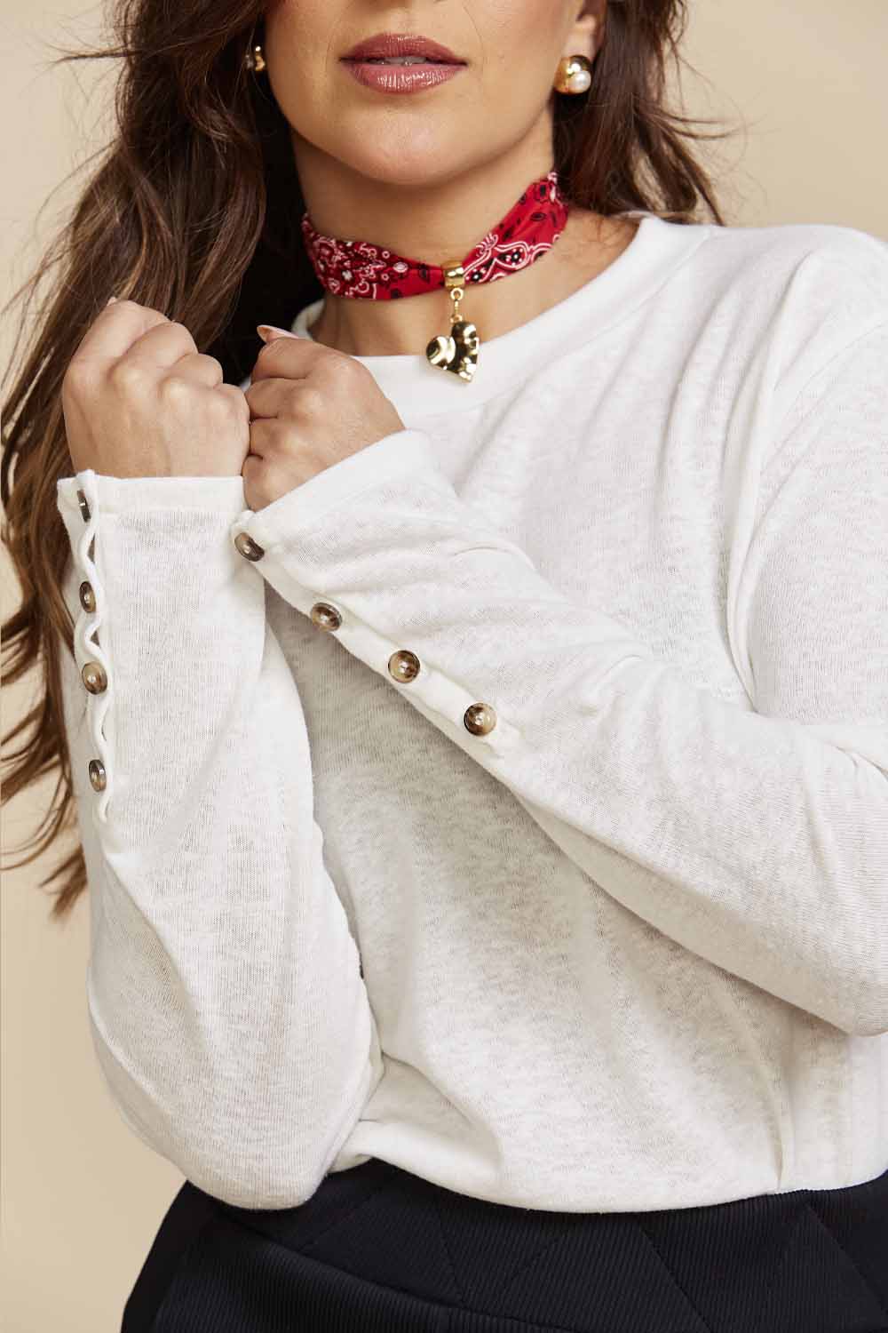 Conforto e estilo em uma peça só. Nossa camiseta off white de manga longa tem modelagem soltinha, com punho canelado na gola, malha leve e detalhe charmoso de botões no punho. Versátil para usar no dia a dia, em viagens ou composições mais urbanas.