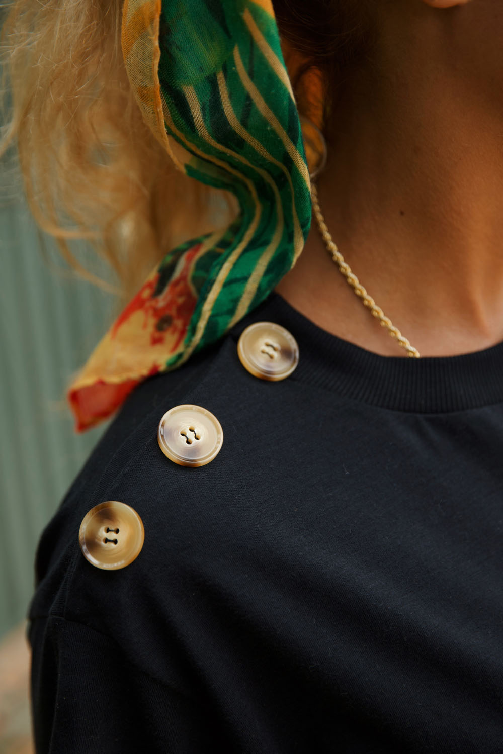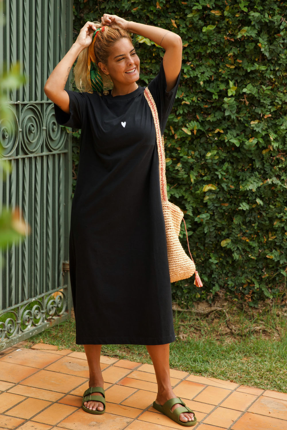 Vestido midi, em malha de algodão preto, bordado centralizado de coração na cor off white, botões nos ombros.